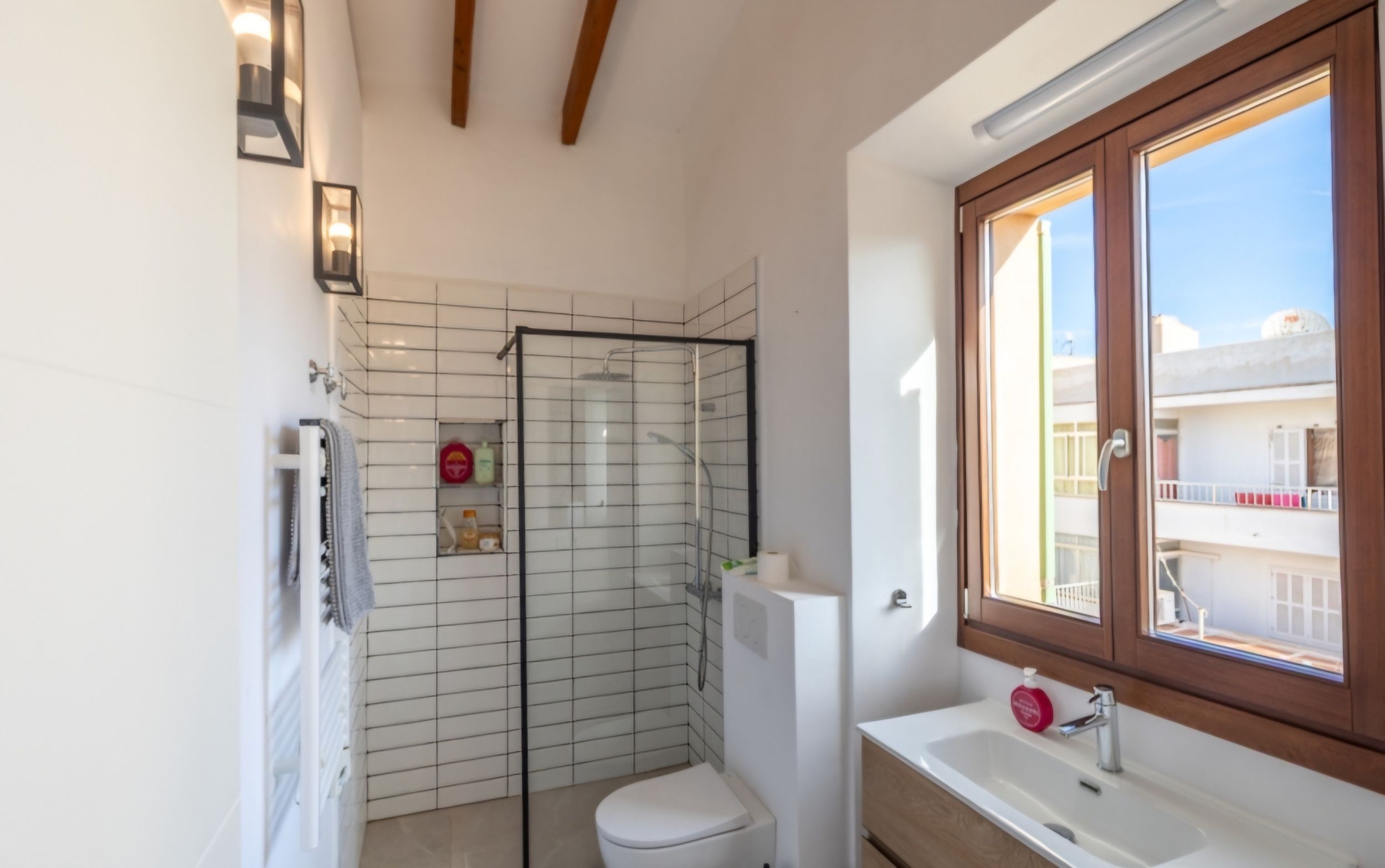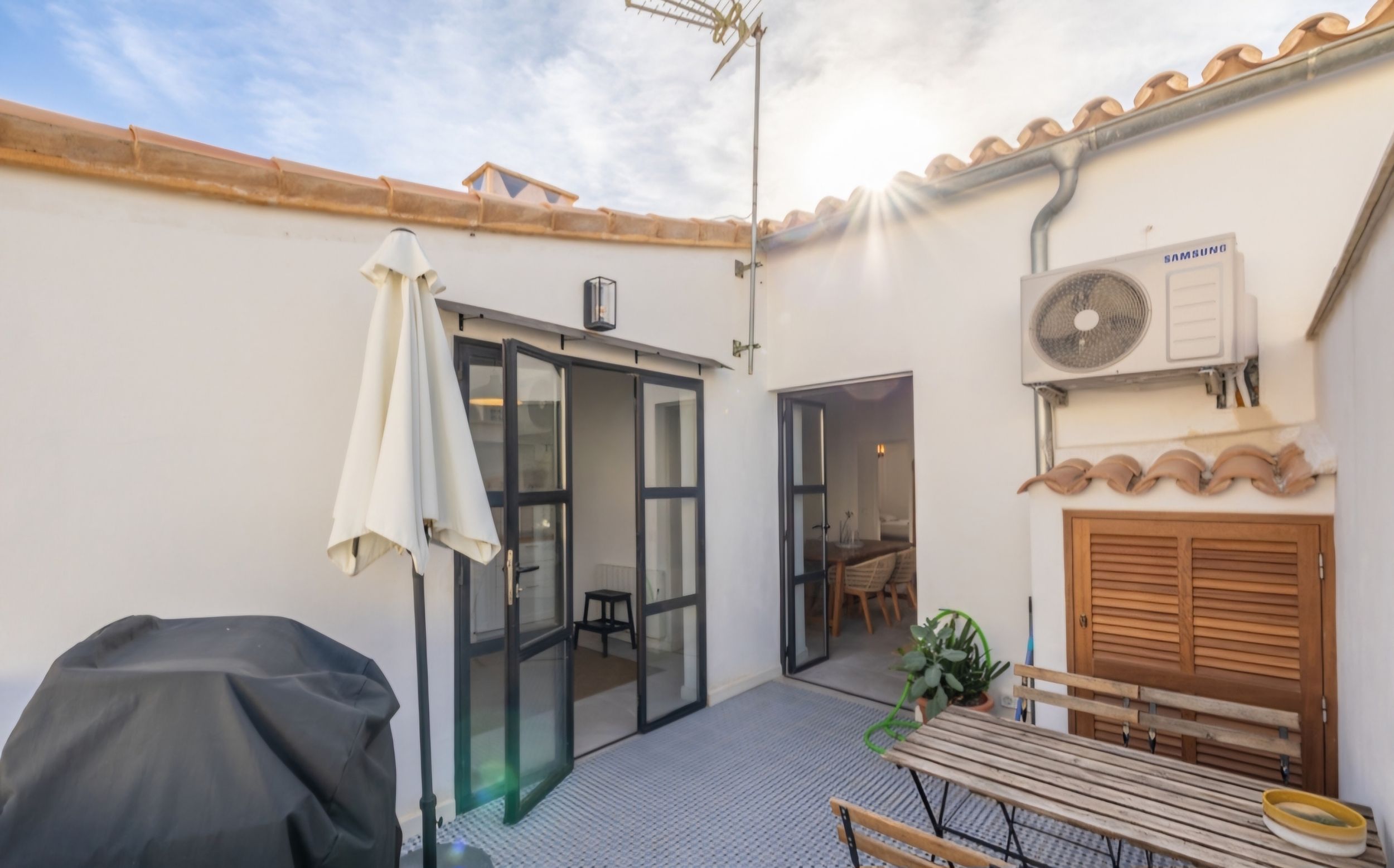 Großformatige Steinzeugfliesen (1 x 1 Meter) in allen Räumen unterstreichen den modernen Charakter der Wohnung und bieten neben ihrer eleganten Optik auch praktische Vorteile wie Pflegeleichtigkeit und Langlebigkeit. Für ein angenehmes Raumklima sorgen Klimaanlagen in sämtlichen Zimmern – ideal für heiße Sommertage. In der kälteren Jahreszeit schaffen elektrische Heizkörper eine behagliche Atmosphäre.